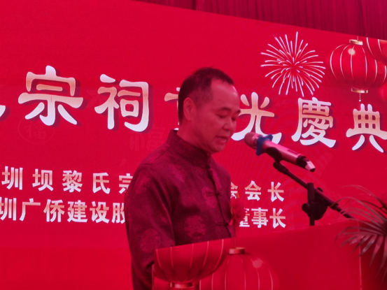 今天是个好日子,也是我们大家迎来二零二六骏马腾飞吉祥年,此时此刻我谨代表天麟公理事会的全体成员,对陆河县下圳坝黎氏十世祖宽公祠重建圆满落成!表示热烈的祝贺!此时向下圳坝黎氏宗亲致以最亲切的问候!祝下圳坝的家人们,事业红红火火!财丁兴旺!儿孙枝叶茂盛!身体健康!家庭幸福!马年大发!谢谢大家!
