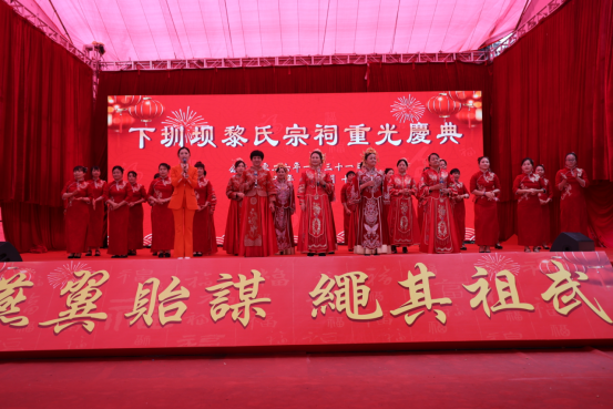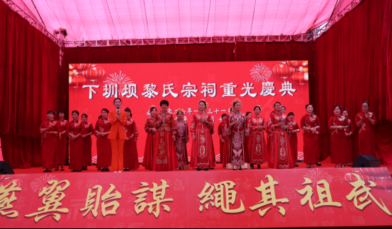 宗祠见证了族人在迁徙动荡中的坚韧与坚守;祭祖扫墓等重要举措,彰显了宗族敬祖睦族、孝悌传家的核心价值观。愿后世子孙铭记先祖迁徙之艰、创业之难,传承"同心同德、慎终追远、弘扬家风、铭记家训"之精髓,让宗祠香火永续,宗族枝繁叶茂,家族荣光代代相传!广东汕尾下圳坝黎氏宗祠的重光庆典,场面壮观震撼,舞台表演节目基本上都是本祠堂后裔金花外嫁女表演;更令人耳目一新的潮汕非遗文化英歌舞表拉滿了粤东黎地黎氏黎人的传统文化底蕴的沉淀内涵。整个宗祠庆典仪式拉满了仪式感,给人们感觉场面热烈隆重,壮观震撼。