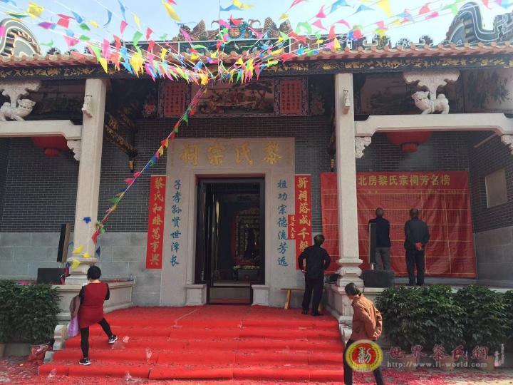 2019年11月26日,地处广东省佛山市南海区丹灶镇金沙北房村热闹非凡,迎来了该区域黎氏族人欢聚首,这是当地黎氏宗祠“贻远堂”重建陞龛落成的庆典日子;据当宗亲黎应浩介绍,他们这支黎氏族人的开基祖是贻远公开基至今有160多年,繁衍后代有六七世,人口有200多人。该宗祠的重修是在原老宗祠地基基础上拆建重修的黎氏宗祠“贻安堂”,占地面积三百平方米,建成今天庄重典雅具有粤风格的黎氏祠宇,宗祠建成后得到了原广州巿市长黎子流宗的肯定,并挥毫泼墨赠送“黎氏家训”匾幅,给该祠宇增添了黎氏古训的文化内函;同时鼓励他们勤学勉,守孝悌,睦族邻,勤节俭的黎氏良好家风、家训、家规的家族文化氛围。